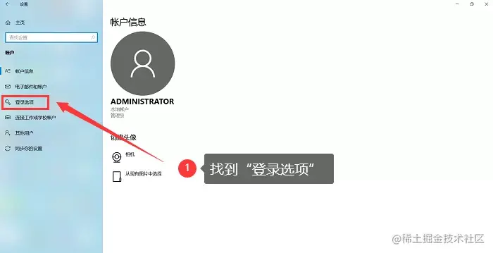 步骤1:** 打开【账户】后,在弹出的窗口左侧找到【登录选项】。如下图:
