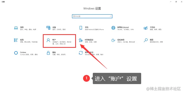 在Windows的设置页面,找到并点击【账户】。如下图: