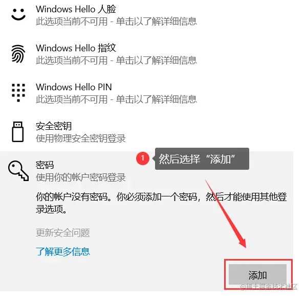 步骤3:** 设置密码方式有很多种:人脸、指纹、密码等(某些密码只能在用户计算机的支持下设置)。如果不了解,建议直接选择【密码】更简单方便。单击【密码】选项,选择【添加】。如下图: