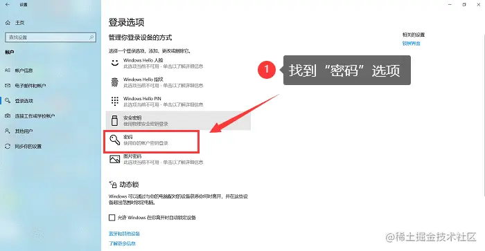 步骤2:** 点击【登录选项】,在页面右侧找到并单击【密码】。如下图:
