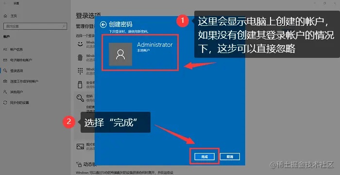 步骤5: 单击【下一步】之后,弹出的窗口会显示该电脑的本地账户。如果没有创建账户,可以直接忽略这一步。直接选择【完成】,下次电脑开机就需要输入你刚刚创建的密码了。如下图: