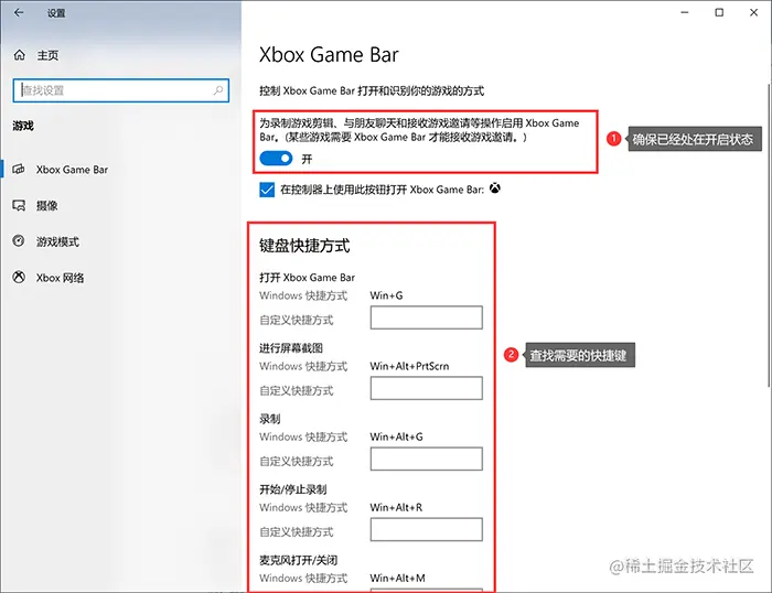 第二步:检查上方的【Xbox Game Bar】是否处在开启状态,如果没有开启则需要将其打开,接着可以在下方找到需要的快捷键了。比如【开始/停止录制】的默认快捷键就是【ctrl+alt+r】。