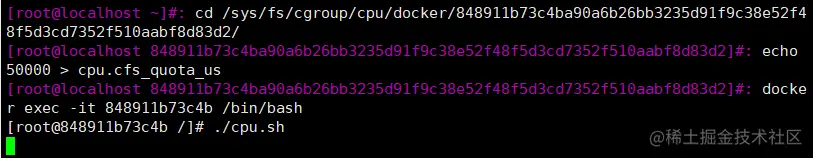cd /sys/fs/cgroup/cpu/docker/848911b73c4ba90a6b26bb3235d91f9c38e52f48f5d3cd7352f510aabf8d83d2/echo 50000 > cpu.cfs_quota_us