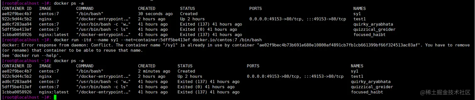 docker run -itd --name sy1 --net=container:5dff5be413ef docker.io/centos:7 /bin/bash