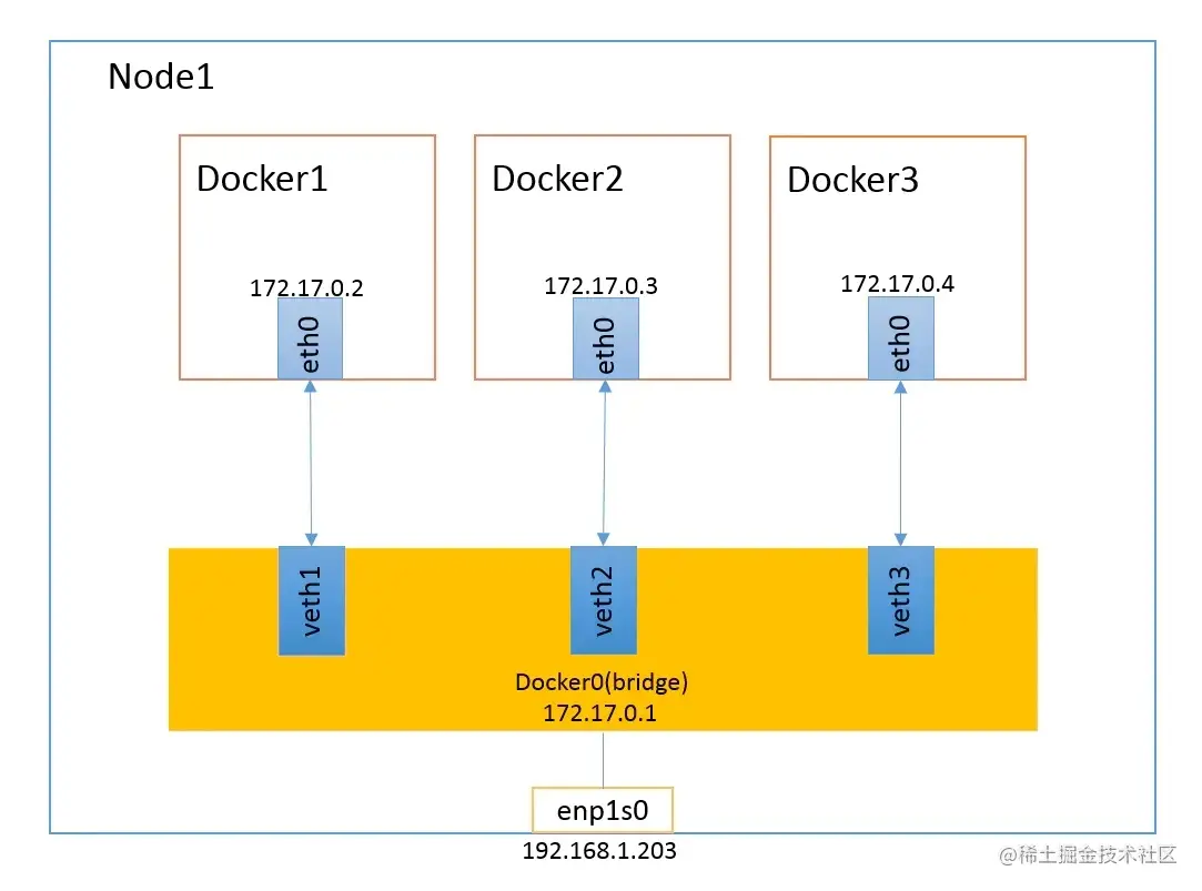 Docker使用Linux桥接,在宿主机虚拟一个Docker容器网桥(docker0),Docker启动一个容器时会根据Docker网桥的网段分配给容器一个IP地址,称为Container-IP,同时Docker网桥是每个容器的默认网关。因为在同一宿主机内的容器都接入同一个网桥,这样容器之间就能够通过容器的 Container-IP 直接通信。