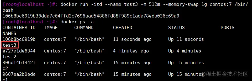 docker run -itd --name test2 -m 512m centos:7 /bin/bash