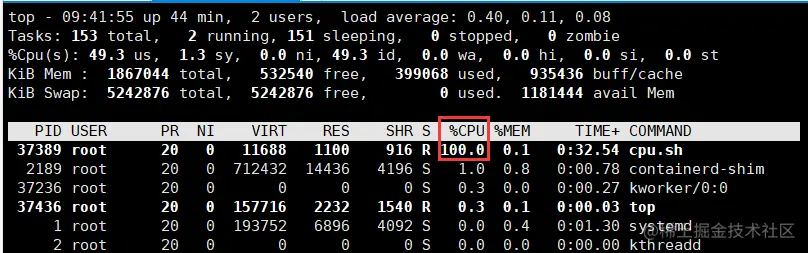top #可以看到cpu占用率接近50%,cgroups对cpu的控制起了效果
