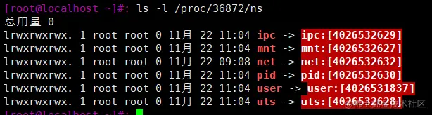 ls -l /proc/36872/ns #查看容器的进程、网络、文件系统等命名空间编号