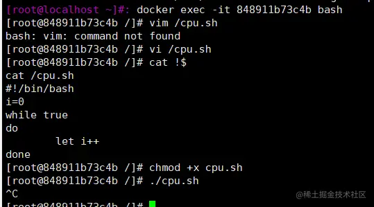 docker exec -it 848911b73c4b /bin/bash./cpu.sh