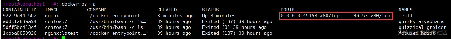 docker run -d --name test1 -P nginx #随机映射端口( 从32768开始)