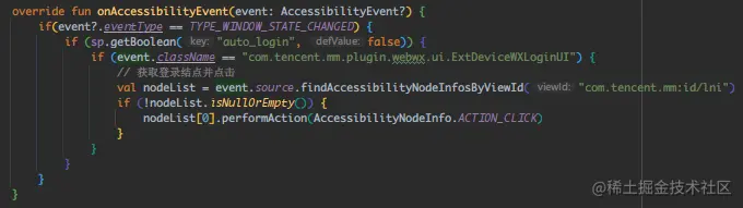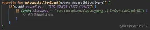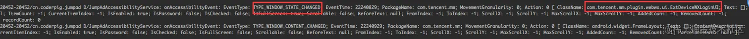 即打开登录页会触发 TYPE_WINDOW_STATE_CHANGED 类型的 Event,且页面为 ExtDeviceWXLoginUI。