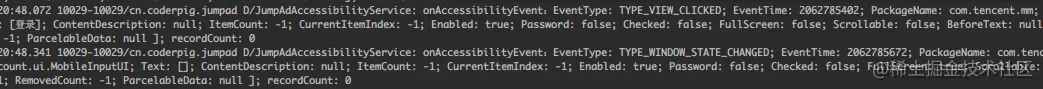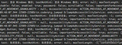 运行后,开启无障碍服务,接着点击登录/或者扫二维码,微信弹出登录页面,可以看到下述日志:
