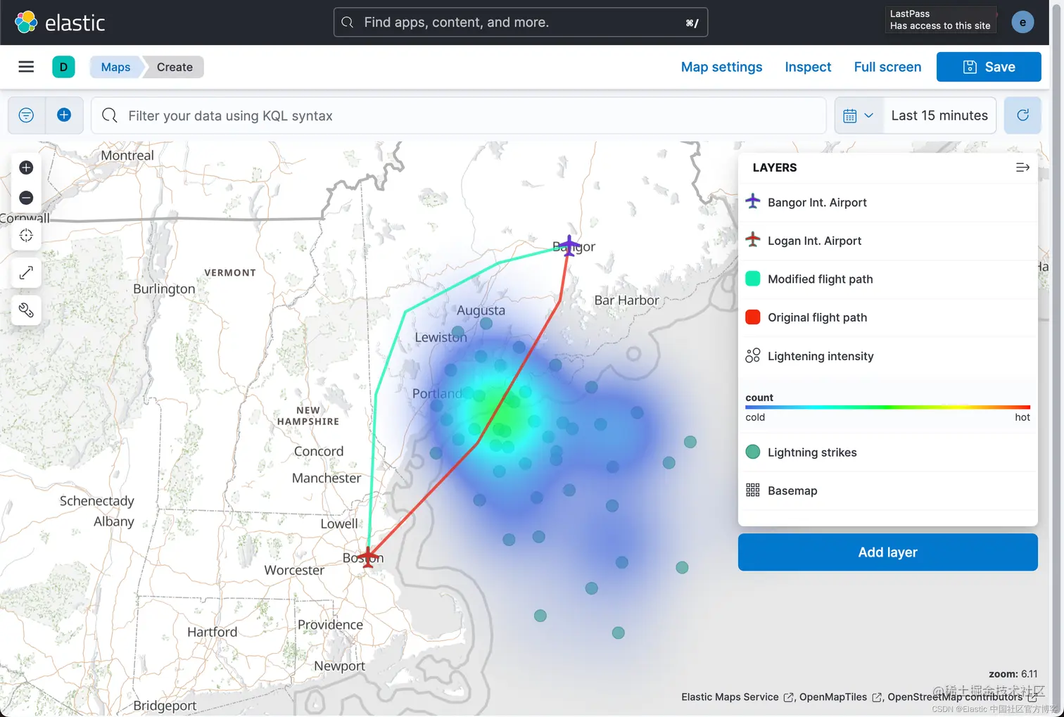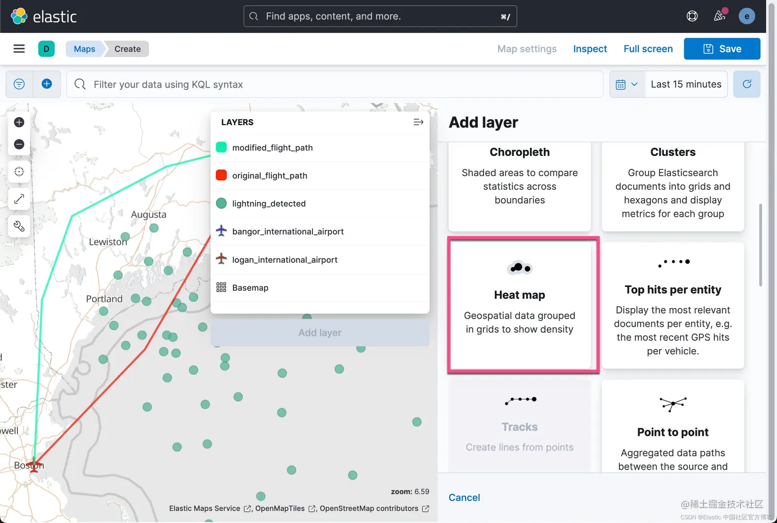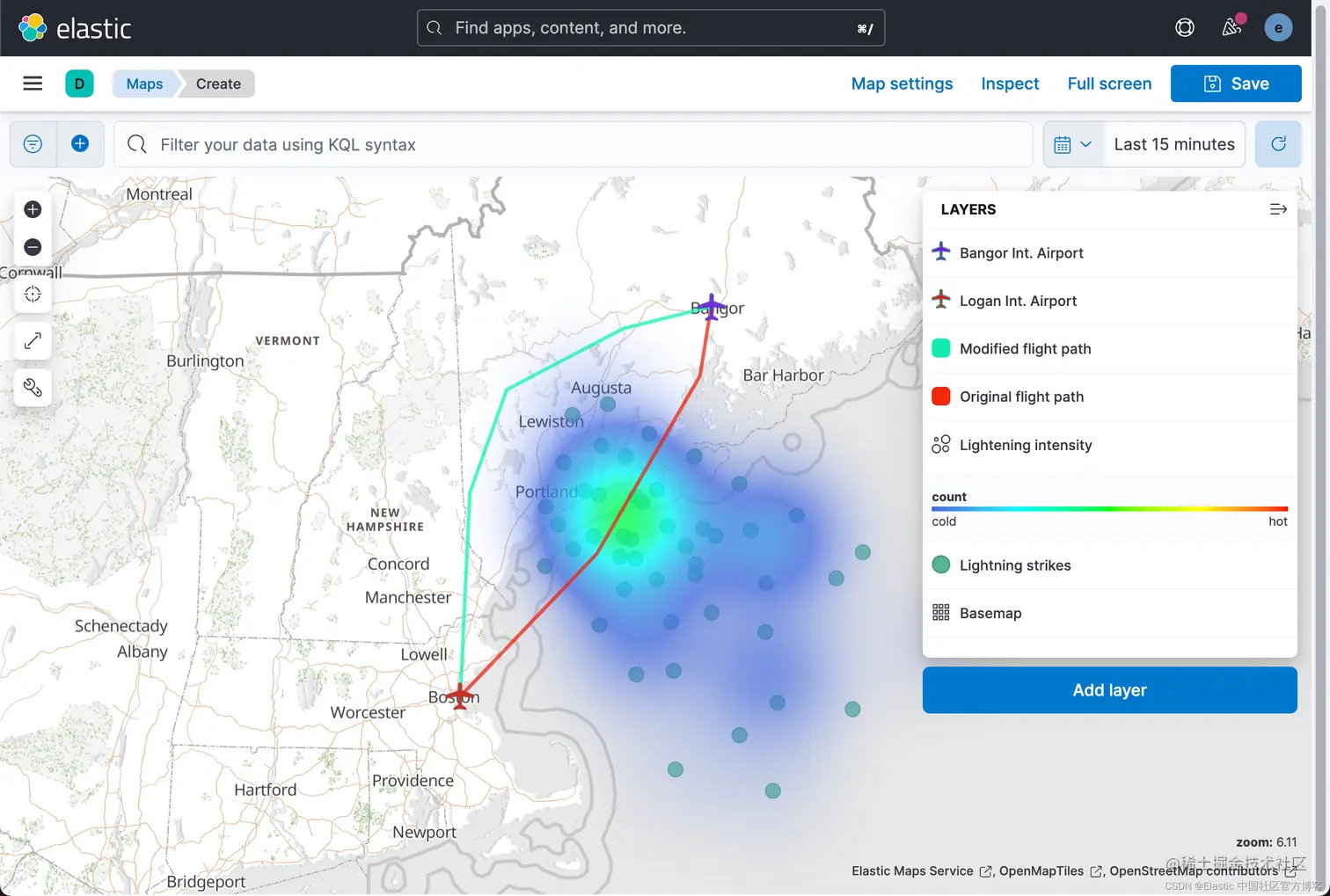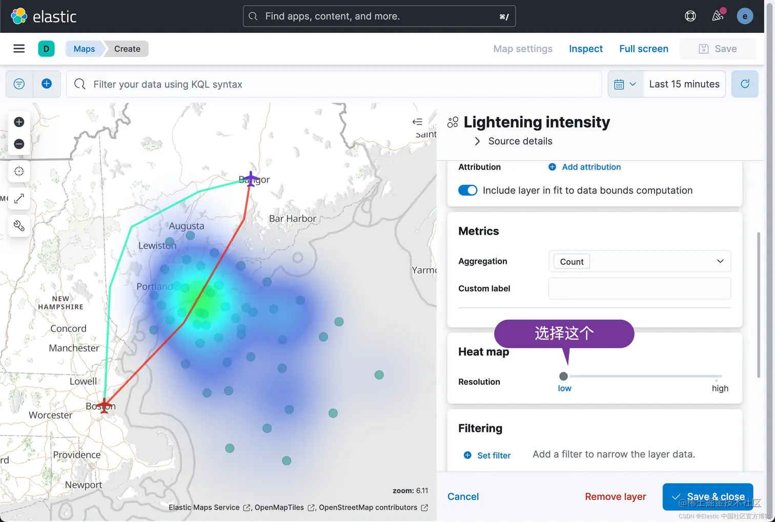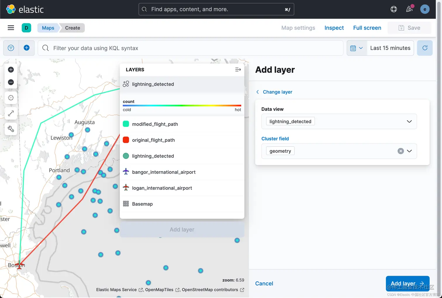 查看 Lightning detected 层,可以清楚地看到闪电击中的位置。 不太清楚的是,某些地区是否比其他地区发生了更多的雷击,换句话说,闪电热点在哪里。 为雷击建立索引的 geo_point 数据的一个优点是你可以对数据执行聚合。