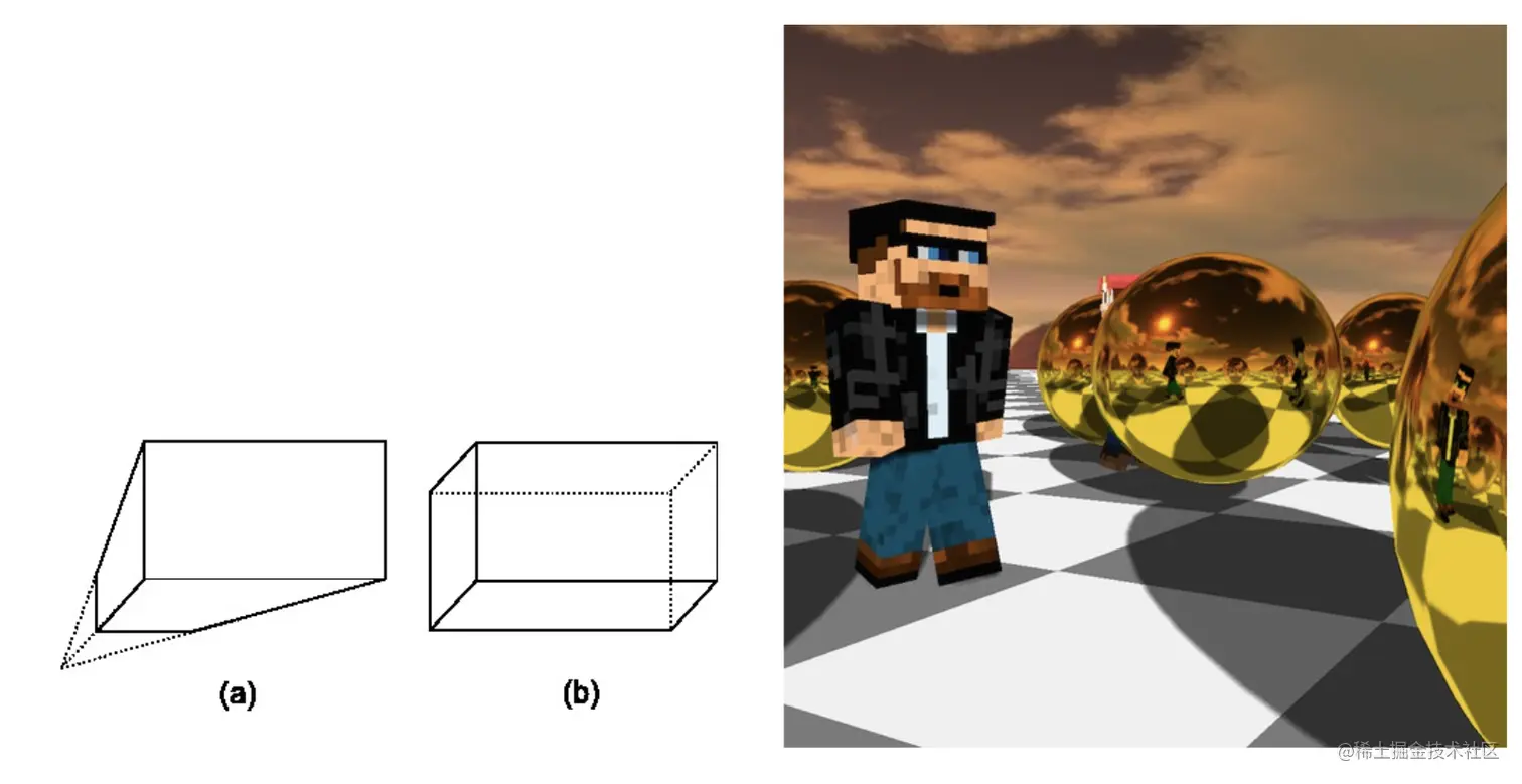 - 正交投影相机捕捉到的画面和他与相机的距离无关,即大小不会根据距离变大而收缩,对于在三维空间内平行的线,投影到二维空间中也一定是平行的(如下左图b);