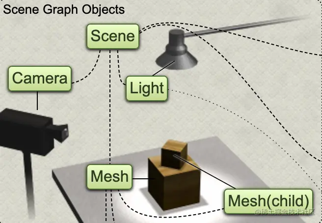 在 web 端实现 3D 效果时,第一个相到的当然都会是 webGL(web graphic language) ,即浏览器原生的一套图形API,但是使用 webGL 进行复杂 3D 效果的开发会大大增加工作量,比如坐标变换,法线贴图、透视模拟等等。所以 three 应运而生,官方对其的介绍是 A 3D javascript library ,早期是由计算机图形学天才Ricardo Cabello 在 2010年开源的框架,至今已有10年的历史。在 three 世界的三大概念分别是 camera(相机) ,scene(场景) ,renderer(渲染器) ,下图是三者的对应关系。