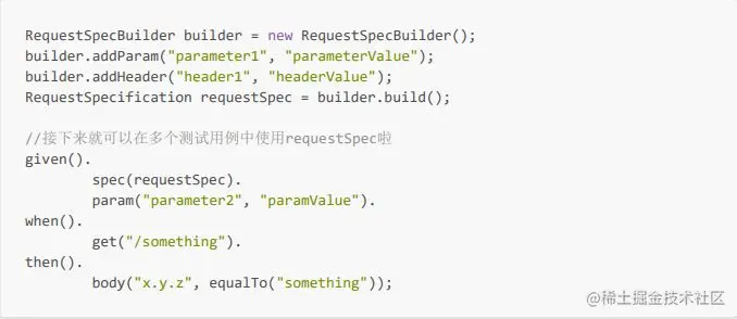 为了达到这个效果,我们可以使用RequestSpecBuilder或 ResponseSpecBuilder来实现,它们之间的区别 是,前者用在请求中,后者则用在body中。