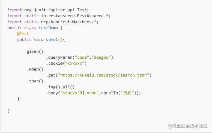答:given用于放置需要的参数,比如上面例子中,我将访问参数:code和cookie放到了given里;when用于填 写要访问的url;then进行断言,来来判断结果是否正确。