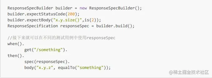 例如,你想在多个测试用例中,都使用这样的断言:判断响应状态码是否为200,并且Json数组"x.y"的大小是否 等于2。你可以定义一个ResponseSpecBuilder来实现这个功能: