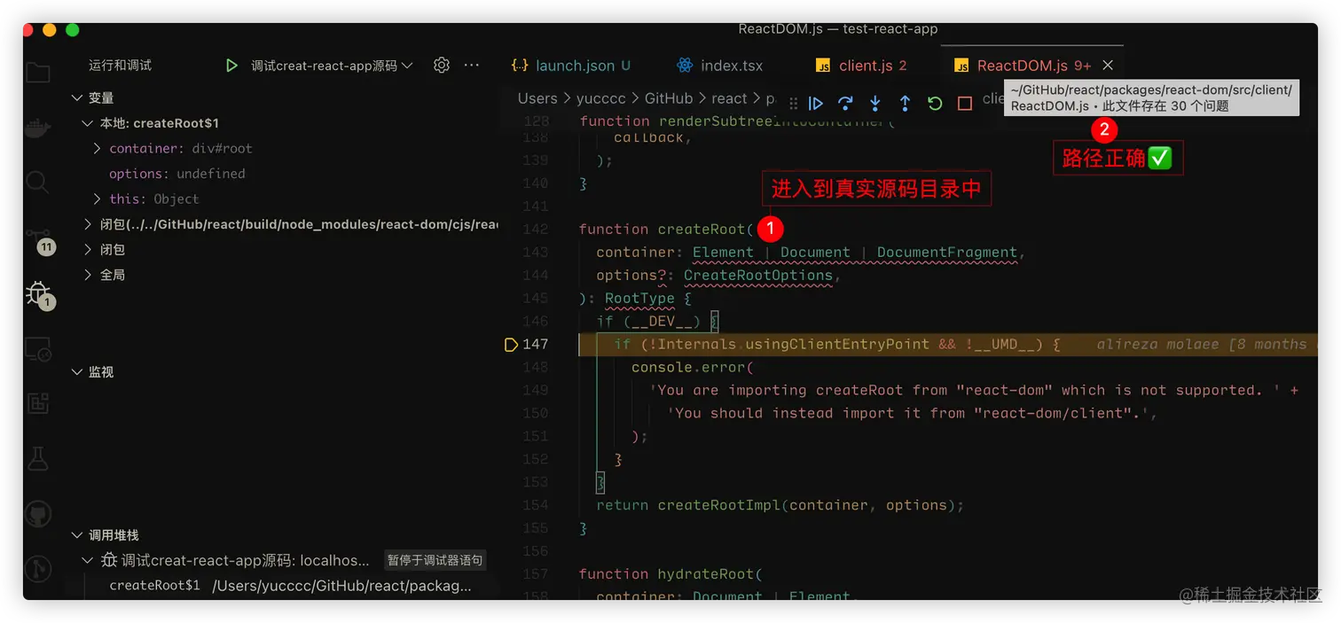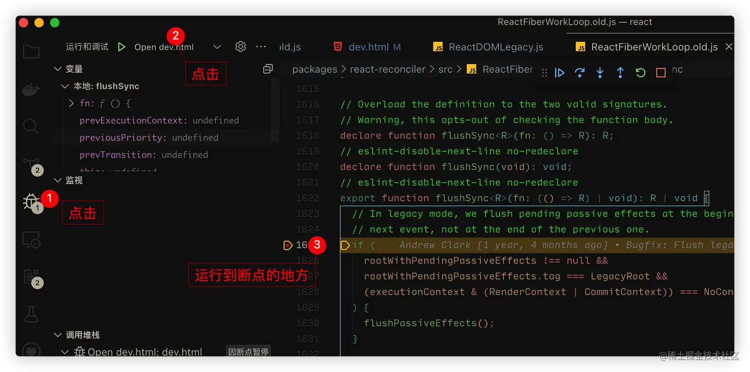/packages/react-dom或者/packages/react会运行到代码打上断点
