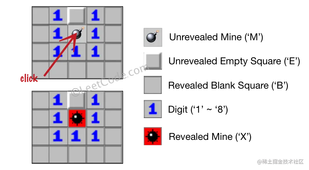 输入:board = [["B","1","E","1","B"],["B","1","M","1","B"],["B","1","1","1","B"],["B","B","B","B","B"]], click = [1,2] 输出:[["B","1","E","1","B"],["B","1","X","1","B"],["B","1","1","1","B"],["B","B","B","B","B"]]