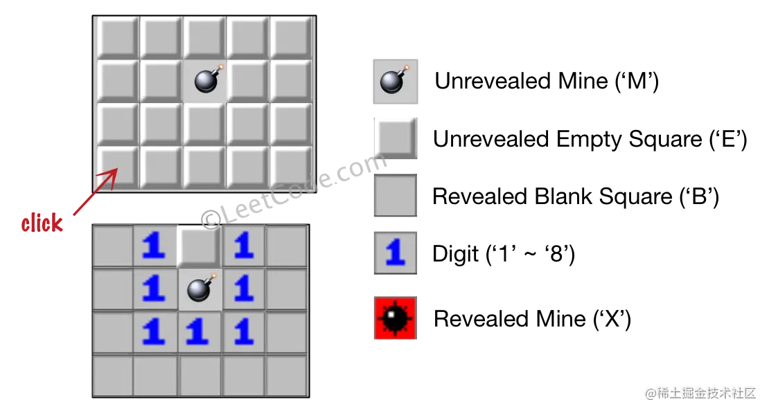 输入:board = [["E","E","E","E","E"],["E","E","M","E","E"],["E","E","E","E","E"],["E","E","E","E","E"]], click = [3,0] 输出:[["B","1","E","1","B"],["B","1","M","1","B"],["B","1","1","1","B"],["B","B","B","B","B"]]