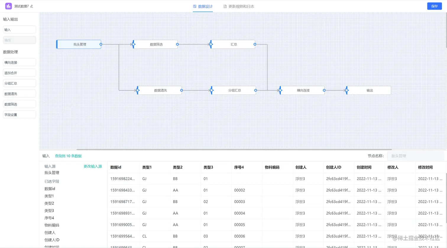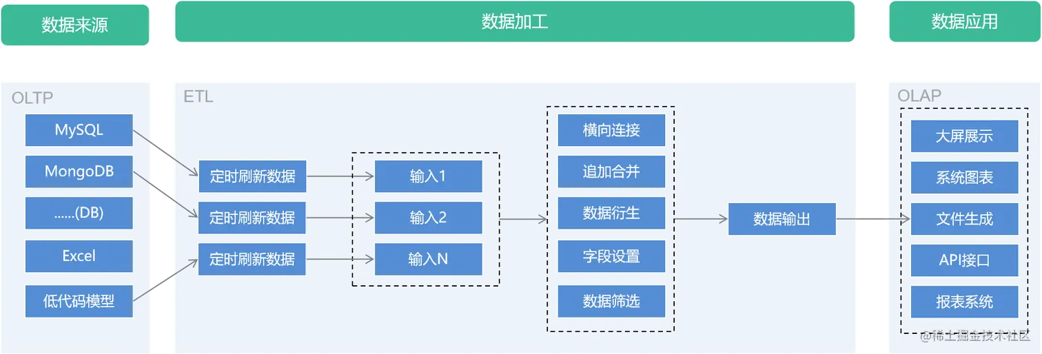 数据智仓包含量大部分,一部分为界面化的ETL,一部分是基于数据的消费引擎,其中包括大屏、图表、与报表,并可以通过低代码的逻辑引擎把数据集通过接口输出出去。