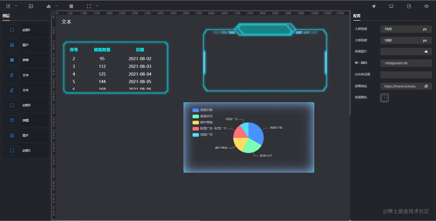 数据大屏是通过拖拽化的配置,实现大屏的展示。