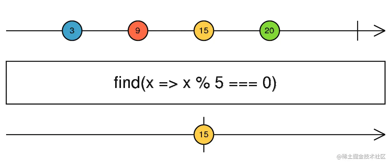 find:从第一个Observable开始,查找符合条件的Observable并返回。