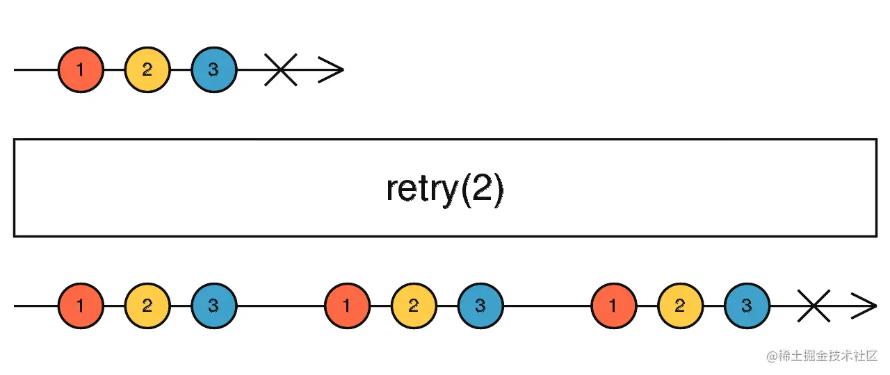 retry:当Observable执行发生错误时,重新订阅Observable并执行,执行次数由入参决定。(可用于接口请求接口)
