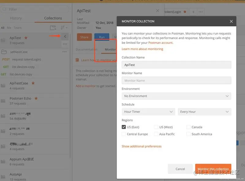 Postman 提供了一个 Monitors (监视器)功能,支持我们提交一个测试任务,按照设置的定时器进行运行,如每小时测试一次,具体操作如下: