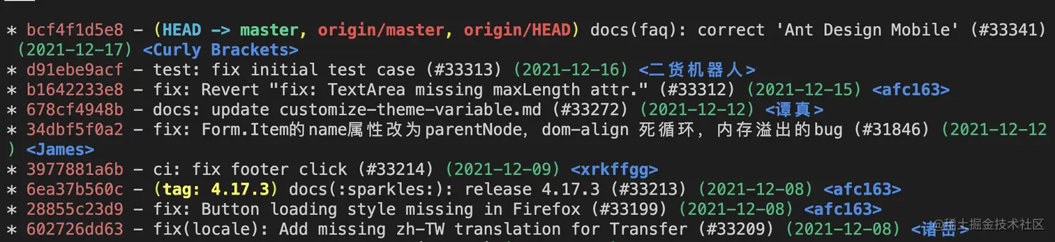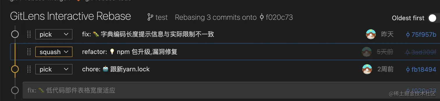 在 vscode 中安装了 gitlens 插件就会有可视化的选择界面,如上图,我选择了 squash,中间的 commit 就合并到了上一次 commit 中,当然我们还可以选择 reword 修改 commit 信息,选择 drop 删除 commit 等。