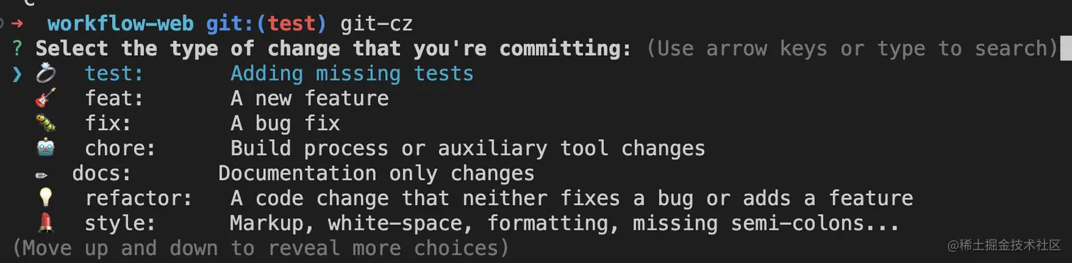 安装后在任意项目中使用 git-cz 代替 git commit,就可以在命令行中进行选择,提交信息会带有 emoji 表情,比较美观。