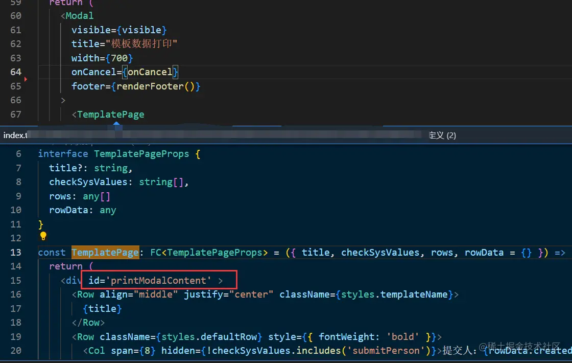 要想打印出在指定区域的内容,那肯定要先找到区域在哪里,我们把弹出框中的内容用一个 div 包裹起来,取个 id,我这里就叫printModalContent