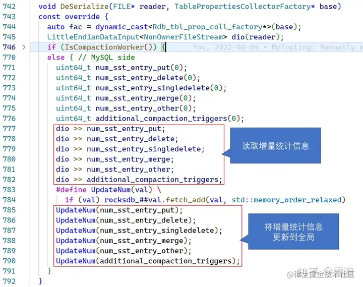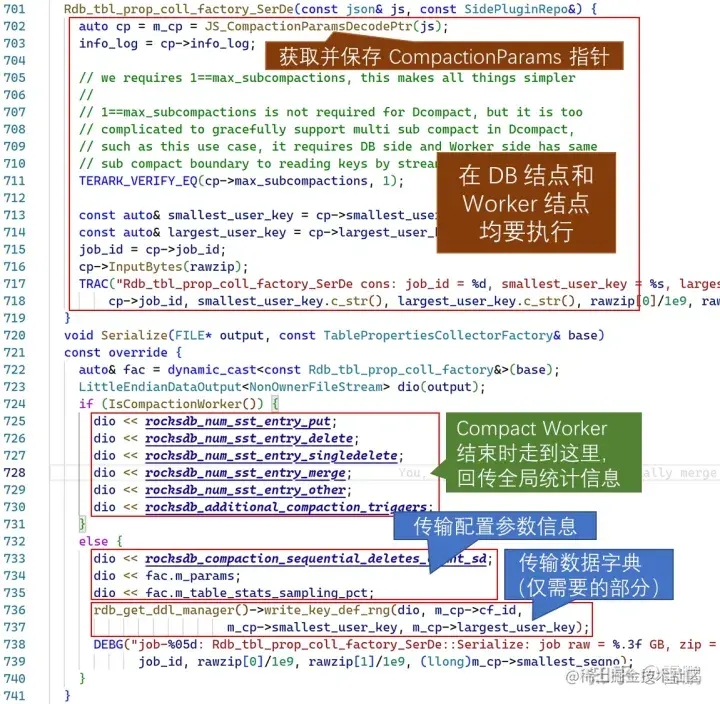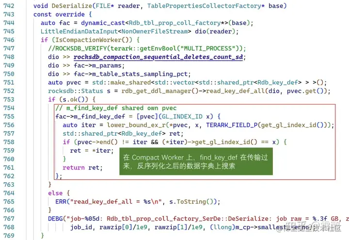 上面有两个函数 write_key_def_rng,read_key_def_all,这是是 MyTopling 为支持分布式 Compact 中传输数据字典而新增的,这里面的代码就不是那么“明显没有 Bug”了。好在使用了 topling-zip 中的序列化框架,使得代码简洁清晰了很多,Rdb_tbl_prop_coll_factory_SerDe 的 Serialize/DeSerialize 也用到了该序列化框架。