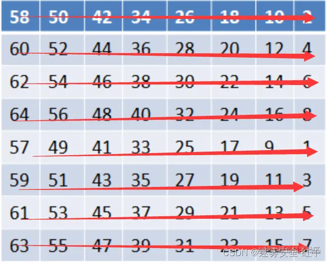 首先前面提过,有八位是奇偶校验位,按64位分成8个字节一组,共八组,取出每一组的最后一位,变成56位