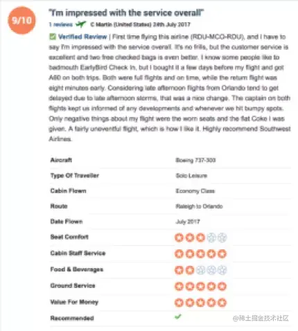 为了更准确地了解飞机的哪些方面影响了客户的意见, 该网站收集客户编写的几乎每家运营航空公司的航班评论。典型的评论如下: