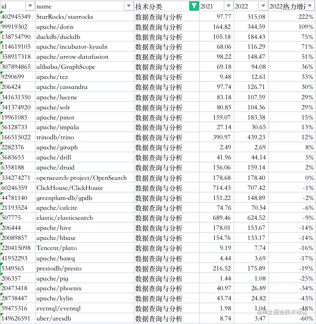 近日,由开放原子开源基金会、X-lab 开放实验室和阿里巴巴开源委员会联合出品的《2022 开源大数据热力报告》(以下简称“报告”)在云栖大会公布。StarRocks 荣登报告 Top 30,并作为数据查询与分析方向增速第一的项目出席了 11 月 17 日的报告圆桌讨论会。