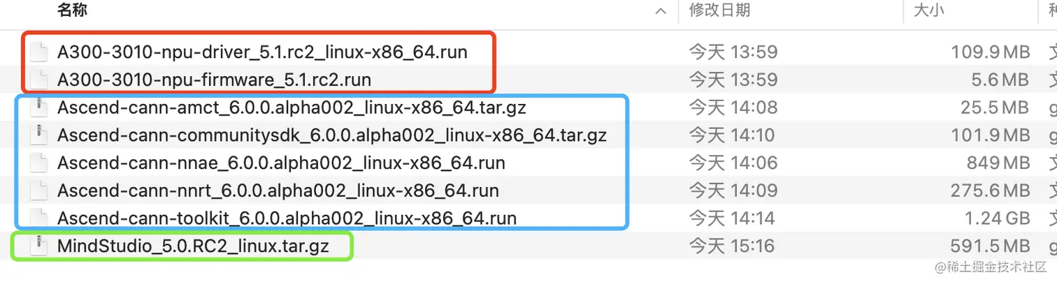 昇腾有个比较麻烦的地方:要是你要下载商用版需要申请,比较麻烦。这里咱们以社区版的安装包为例进行,下载好这些文件 (我这里是 x86 的,如果你是 arm 的机器就下载 arm 版本的):