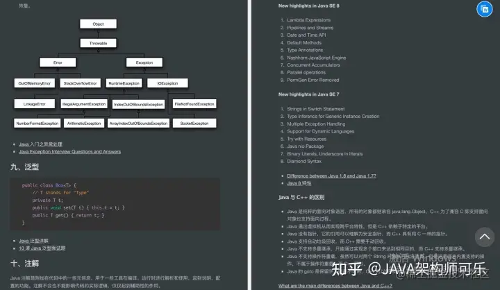此章节分为11个小节包括数据类型,String,运算,关键字,Object 通⽤⽅法,继承,反射,异常,泛型,注解,特性等知识点