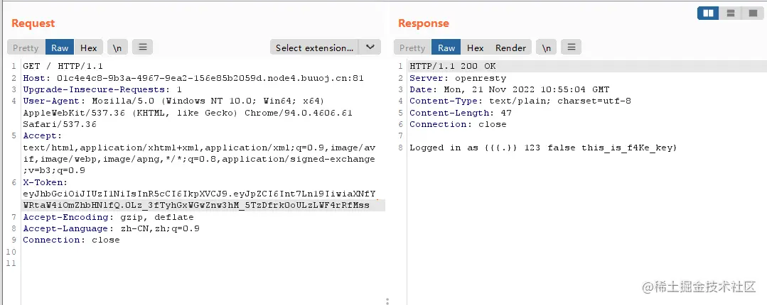func flag_handler(w http.ResponseWriter, r *http.Request) { token := r.Header.Get("X-Token") if token != "" { id, is_admin := jwt_decode(token) if is_admin == true { //将is_admin修改为true即可得到flag p := Resp{true, "Hi " + id + ", flag is " + flag} res, err := json.Marshal(p) if err != nil { } w.Write(res) return } else { w.WriteHeader(http.StatusForbidden) return } }}