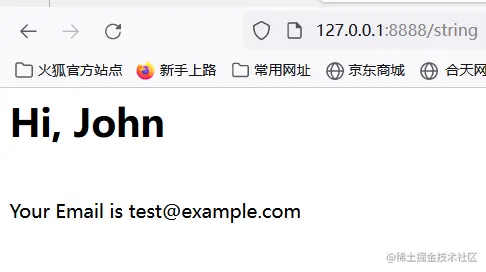 模板内容 <h1>Hi, {{ .Name }}</h1><br>Your Email is {{ .Email }}期待输出 <h1>Hi, John</h1><br>Your Email is test@example.com