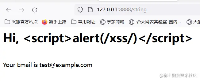 模板内容 <h1>Hi, {{"<script>alert(/xss/)</script>"}}</h1><br>Your Email is {{ .Email }}期待输出 <h1>Hi, {{"<script>alert(/xss/)</script>"}}</h1><br>Your Email is test@example.com实际输出 弹出/xss/
