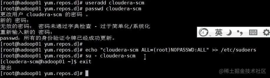 useradd cloudera-scm passwd cloudera-scm pwd: test123456