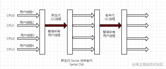 - 线程暂停:Serial 在进行垃圾收集的时,必须暂停其他所有的工作线程,直到垃圾收集结束;