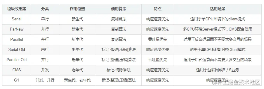 - 并行收集器:Parallel Scavenge 收集器、Parallel Old 收集器、ParNew 收集器;