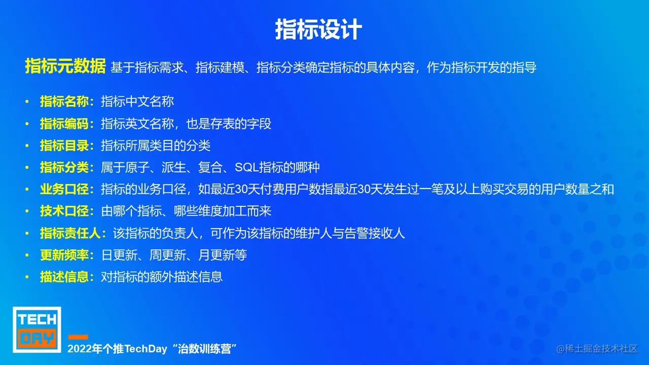 数据指标是一种特定类型的元数据信息,是将业务单元细分后量化的度量值,同时也是业务和数据的交汇点。数据指标使得业务目标可描述、可度量、可拆解,能够为产品运营日常开发迭代以及引导科学决策提供可量化的支持。