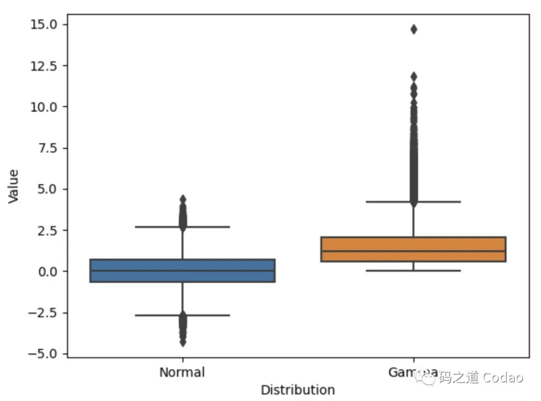因此对于这些非线性分布来说,平均值就不是一个合理的判断指标,而咱们可以采用「中位数」(Medium)来表示其大致的中心位置。咱们有很多种处理这种非线形分布的工具,其中一种就是「箱线图」(Box Plot)。如下图,两个分布被抽象为了一个箱和几条线,其中箱中心线就是中位数,而边缘是四分之一和四分之三分位线。这样不需要做过多复杂的分析就可以在一张图上一目了然的看出大致的分布情况。