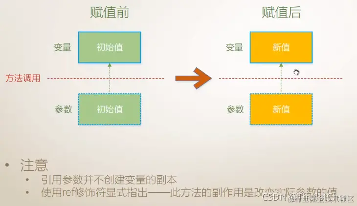 由于形参与实参指向的是同一个存储数据的地址,值类型以引用参数的方式传进方法的时候,它在方法体中就变成了一个形参,在方法体内对应用进来的实参,也就是对形参进行赋值的时候,由于引用参数的形参实参指向的是内存当中的同一个地址,所以会同时改变方法内部的形参和方法外部的实参。