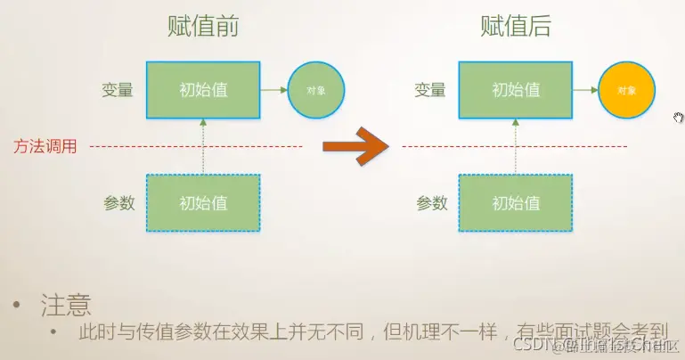与值类型一样,方法都是对所谓的”形参“进行操作,而实参不会受到影响;在方法调用前后(赋值前),引用变量和引用参数的初始值(实参和形参)都指向的是同一个对象(存储着同一对象的地址);在赋值之后(方法内部),由于传进来的(方法调用的)是一个引用类型的值,那么这个引用类型的”形参“被赋值之后会由于赋值号的右边为new操作符的表达式,进而又创建了一个新的对象并且调用对象的实例构造器然后把传进来的值赋给这个对象,而新的引用参数则存储的是新的对象的地址。