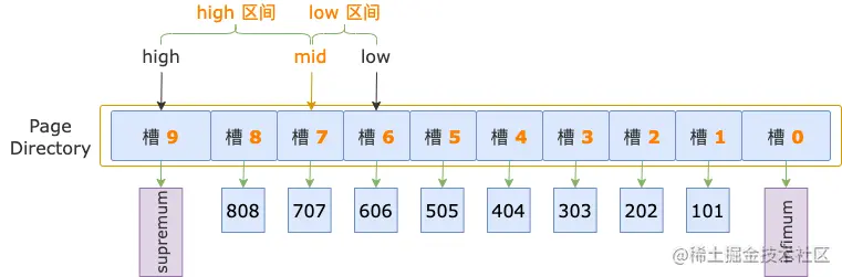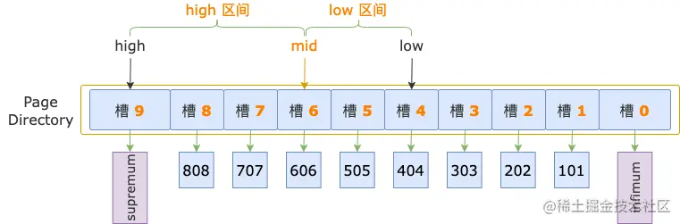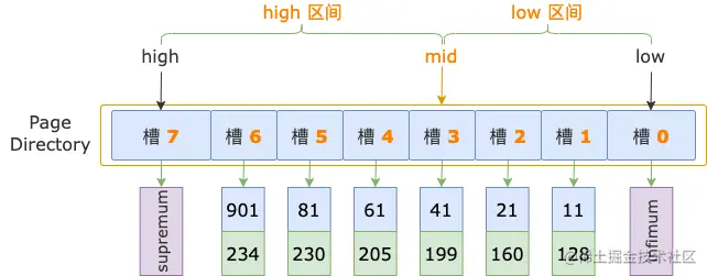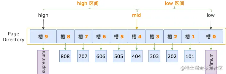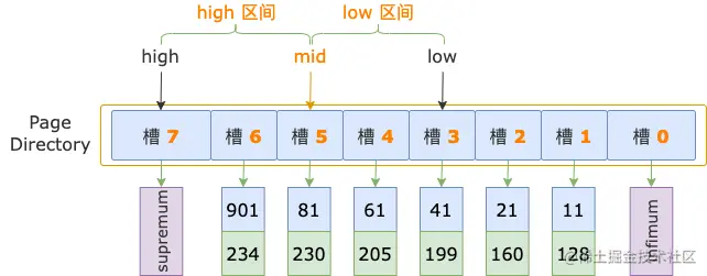 读取 PAGE_N_DIR_SLOTS 的值,得到槽的数量,然后减 1,计算出槽的最大序号:high = PAGE_N_DIR_SLOTS - 1,由此,我们就得到了二分法的初始状态的上边界。